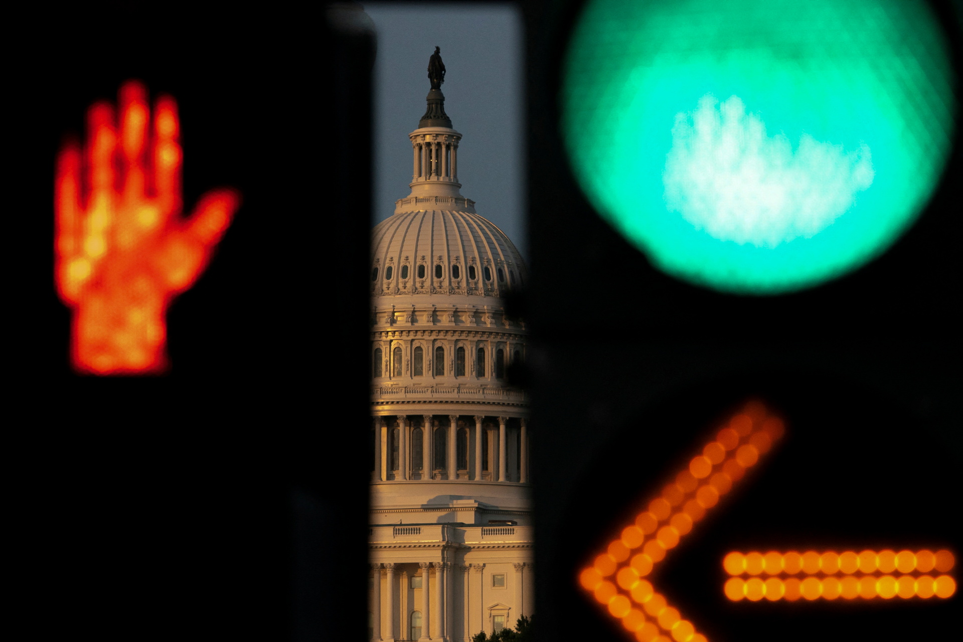 Холбооны засгийн газрын зарим үйл ажиллагаа зогссонтой холбоотойгоор Үндэсний цэцэрлэгт хүрээлэн (National Mall) дээрх элстэй шуудайнуудын ард харагдах Капитолын ордон. 2025 оны 10-р сарын 8. REUTERS/Jonathan Ernst