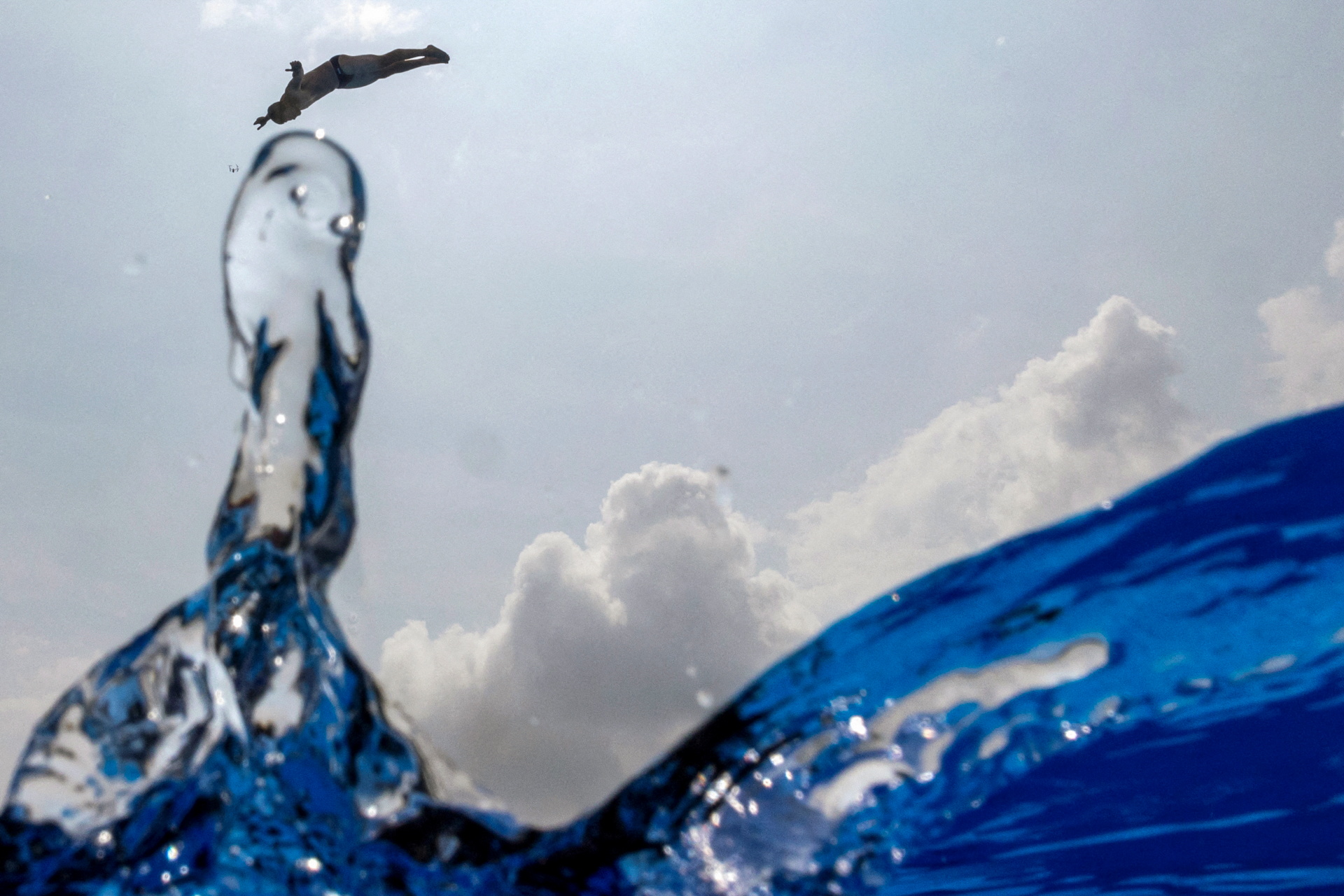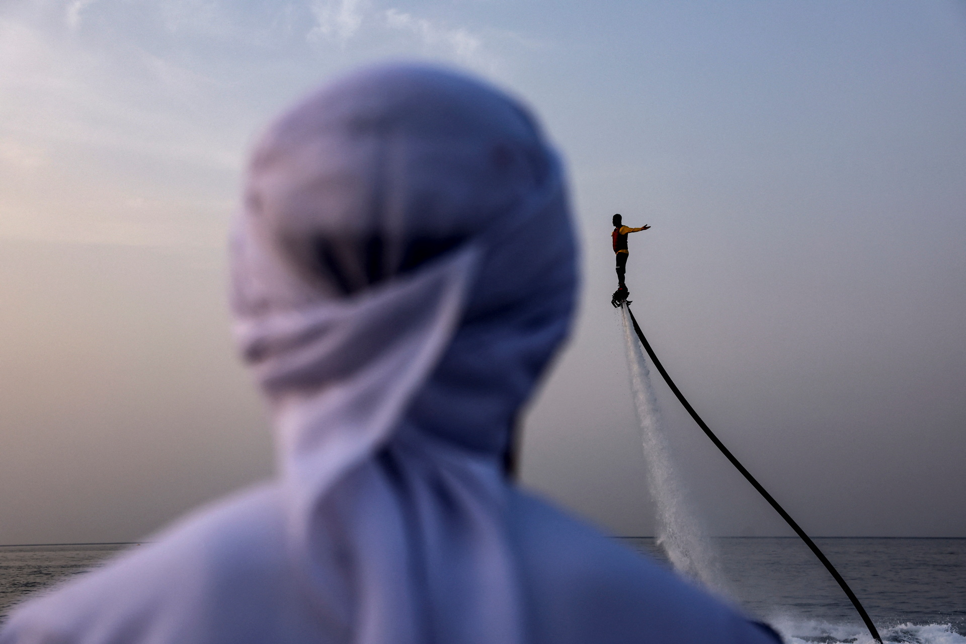 Оманы Мусандад зохион байгуулагдсан усан үзүүлбэрийн үеэр флайборд дээр нисэж буй хүнийг ажиглан харж буй эрэгтэй, 2025 оны 8-р сарын 27. REUTERS/Amr Alfiky