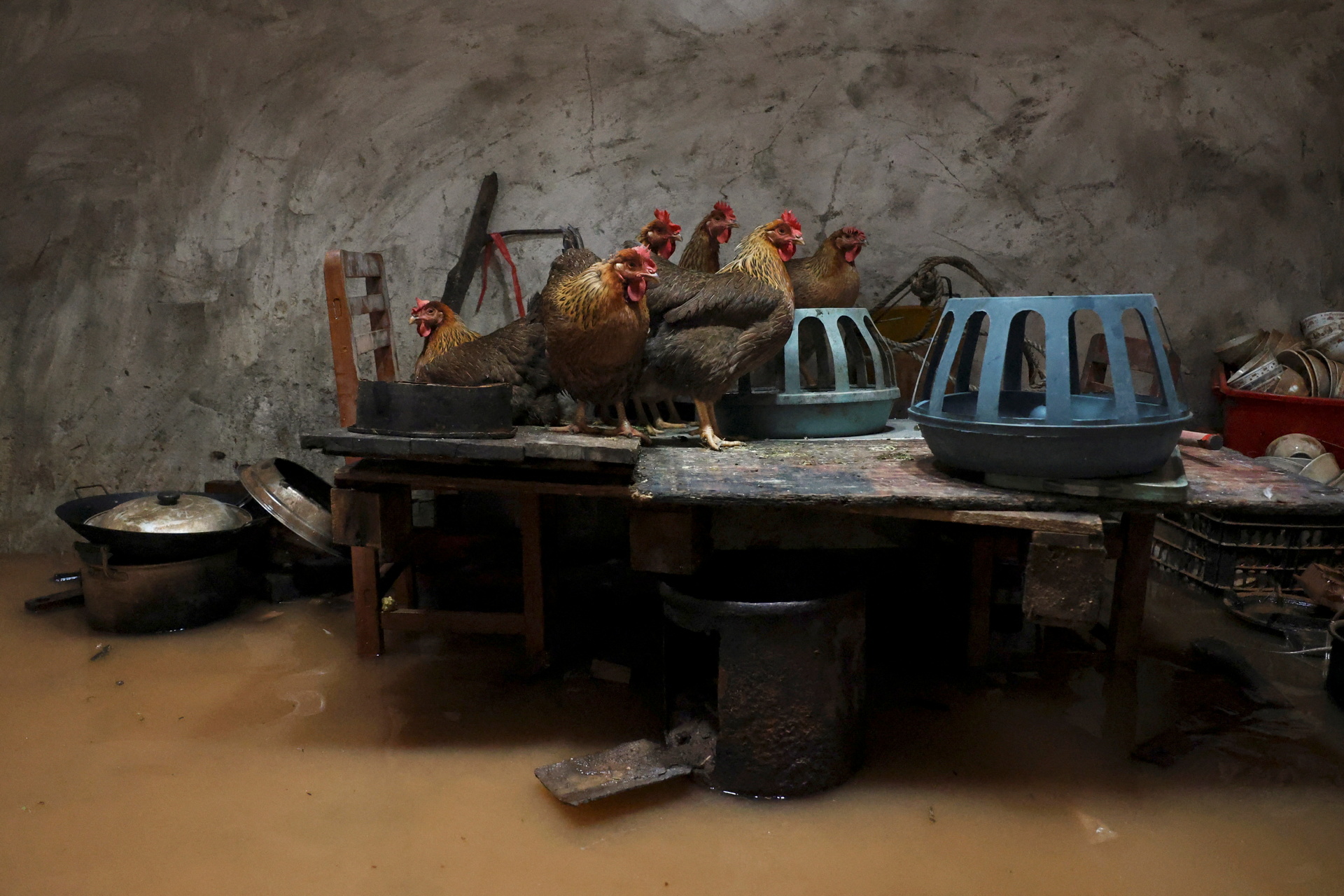 Хэд хоног үргэлжилсэн их борооны улмаас үерт автсан байшингийн гал тогооны тавцан дээр зогсож буй тахианууд, 2025 оны 8-р сарын 8. REUTERS/Florence Lo