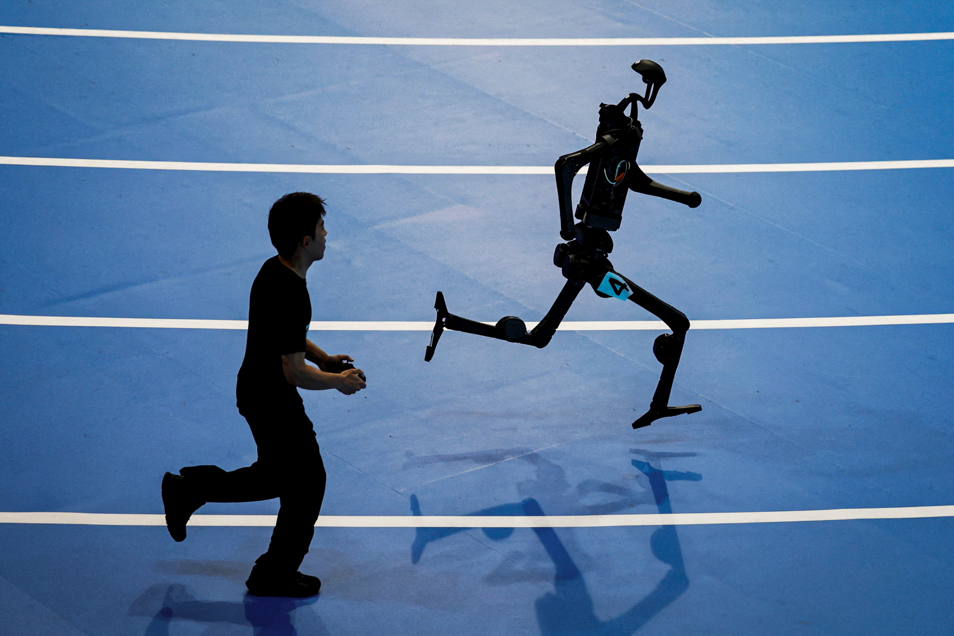 БНХАУ-ын Бээжин хотод, Үндэсний хурдны тэшүүрийн ордонд зохион байгуулагдсан анхны Дэлхийн хүн дүрст роботын наадмын 400 метрийн уралдаанд оролцож буй Unitree Robotics компанийн хүн дүрст робот, 2025 оны 8-р сарын 15. REUTERS/Tingshu Wang