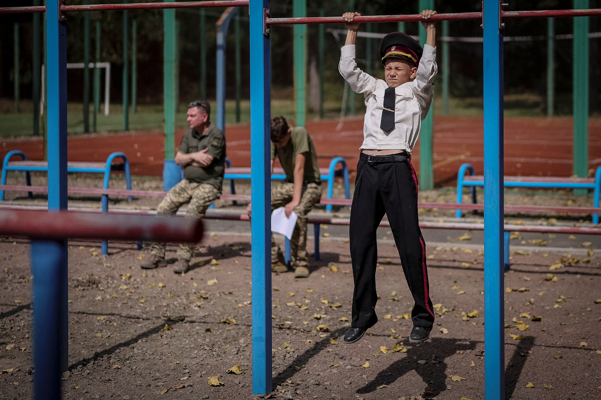 Шинэ хичээлийн жилийн эхлэлийг тэмдэглэсэн ёслолын дараа суниалт хийж буй залуу цэргийн кадет, Украин улсын Киев хотод, 2025 оны 9-р сарын 1. REUTERS/Gleb Garanich