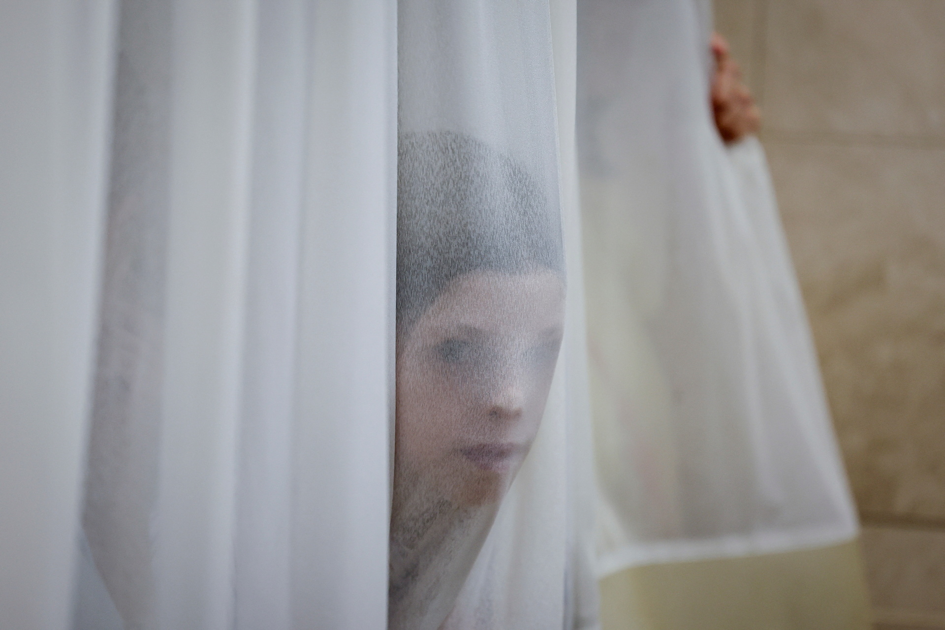 Иерусалим хотын захад автобусны буудал дээр палестин зэвсэгт этгээдүүд гал нээсний улмаас амь үрэгдсэн израиль иргэн Леви Ицхак Пашийн оршуулгын ёслолын жагсаалын үеэр хөшигний цаана зогсож буй охин, 2025 оны 9-р сарын 8. REUTERS/Ronen Zvulun