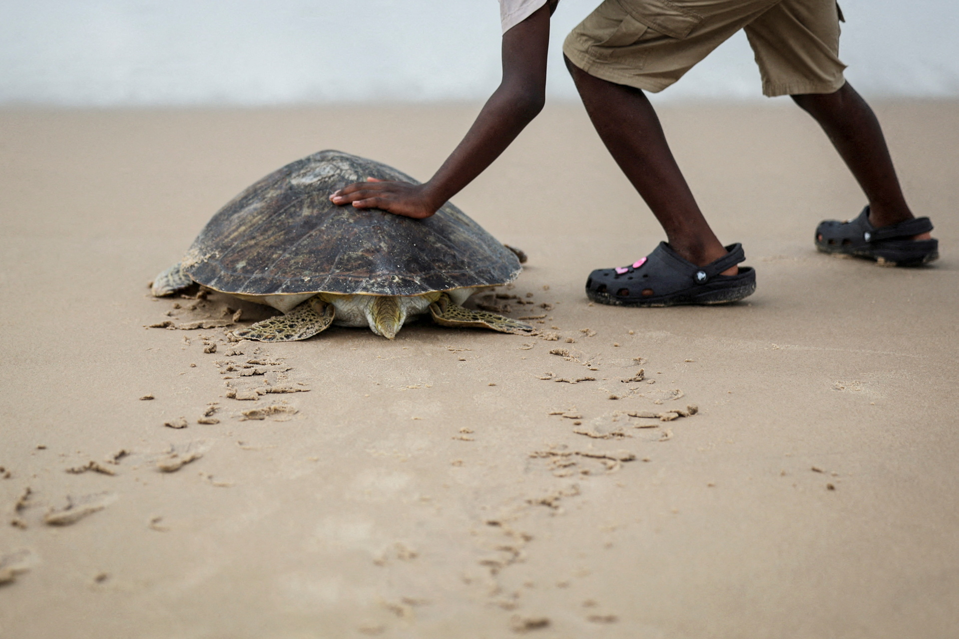 Дэлхийн цэвэрлэгээний өдрийг тохиолдуулан зохион байгуулсан эргийн цэвэрлэгээний үеэр, аврагдсан далайн яст мэлхийн хуягт хүрч буй хүү, Нигерийн Лагос хотод, 2025 оны 9-р сарын 20. REUTERS/Sodiq Adelakun