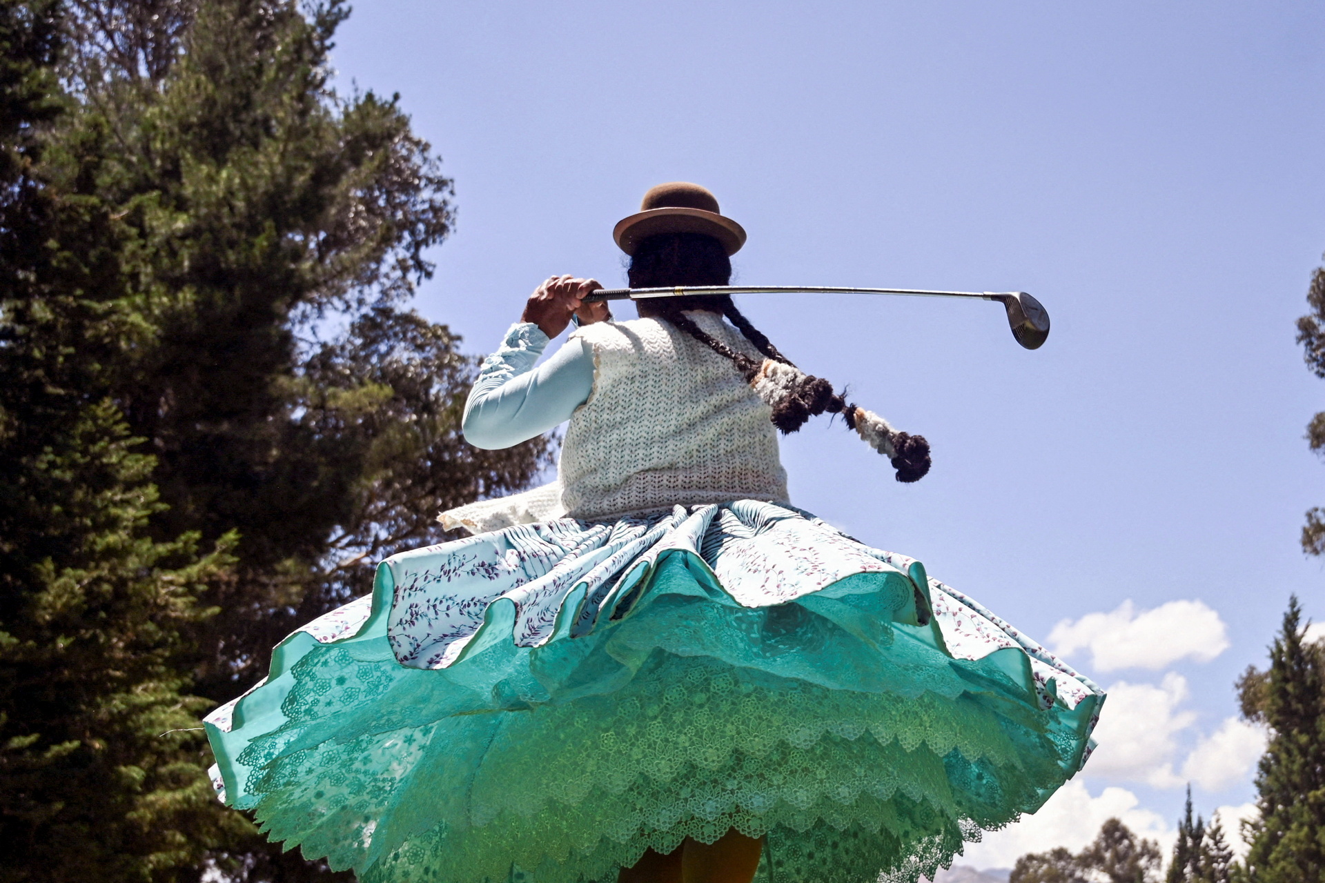 Уламжлалт поллера банзалтайгаар гольф тоглодог Аймара угсааны цөөн эмэгтэйчүүдийн нэг, “чолита” гольфчин Марта Мамани чөлөөт цагаараа Ла-Пасын гольфын клубт тоглож буй нь, Боливийн Ла-Пас хотод, 2025 оны 9-р сарын 29. REUTERS/Claudia Morales