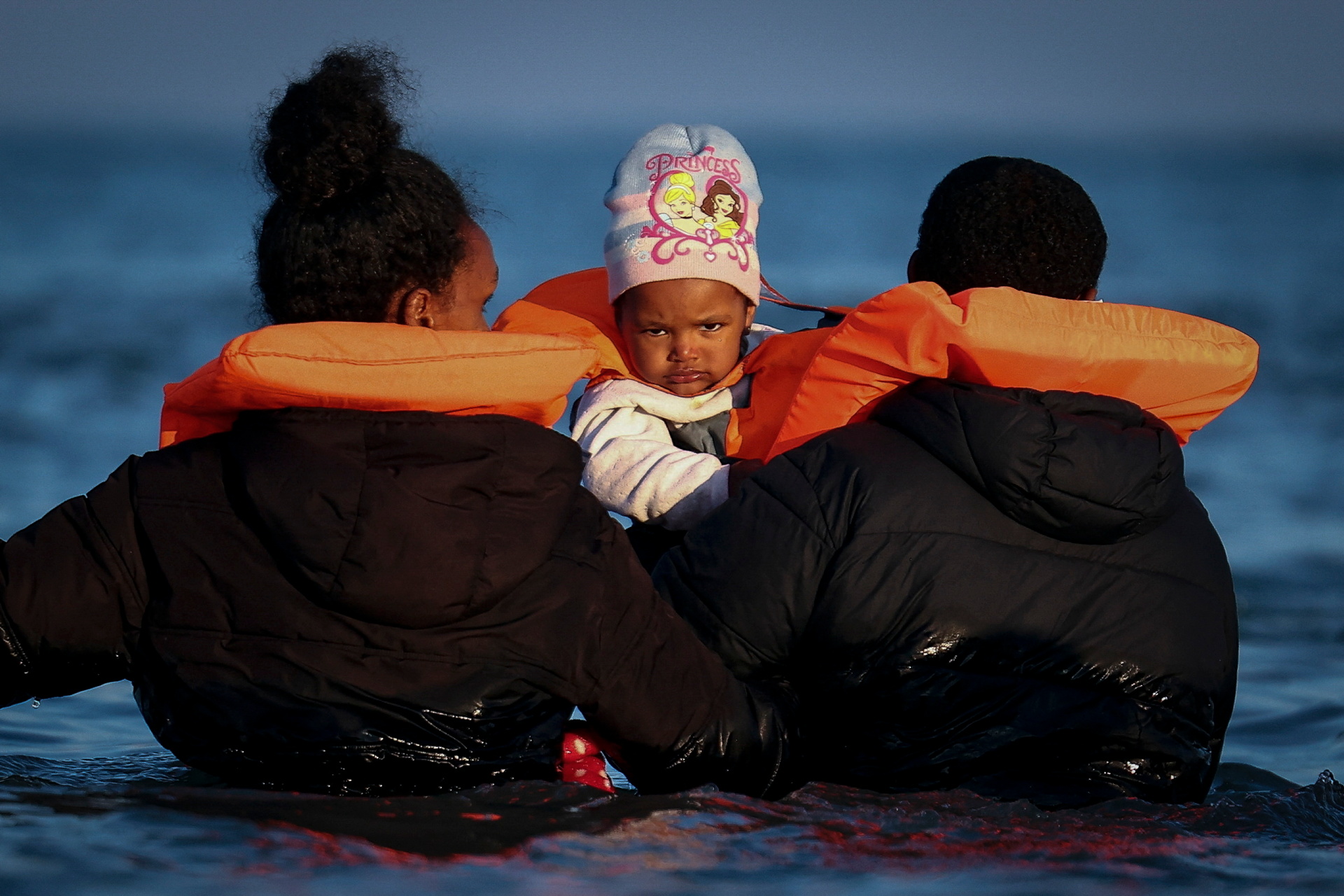 Их Британи хүрэхээр Английн суваг гатлан явах хийлдэг завинд суухаар Францын хойд эргээс далай руу орж буй цагаачид, Кале хотын ойролцоох Гравлин дахь Пти-Фор-Филиппийн эргээс, 2025 оны 9-р сарын 27. REUTERS/Abdul Saboor