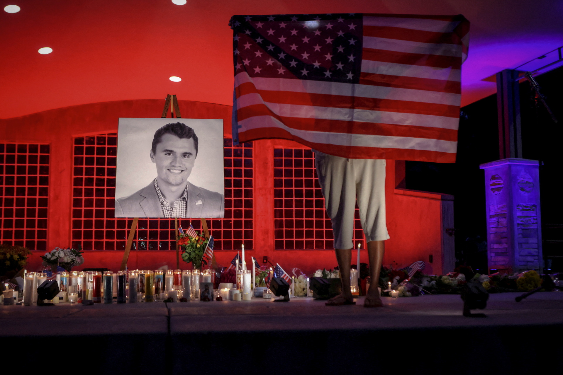 АНУ-ын Ерөнхийлөгч Дональд Трампын холбоотон, барууны үзэлт идэвхтэн Чарли Кирк Юта Валли их сургууль дээр болсон арга хэмжээний үеэр буудуулж амь үрэгдсэний дараа Орем хотын төв цэцэрлэгт хүрээлэнд болсон зул өргөх ёслолын үеэр АНУ-ын төрийн далбааг барьж буй нэгэн хүн. 2025 оны 9-р сарын 11. REUTERS/Jim Urquhart