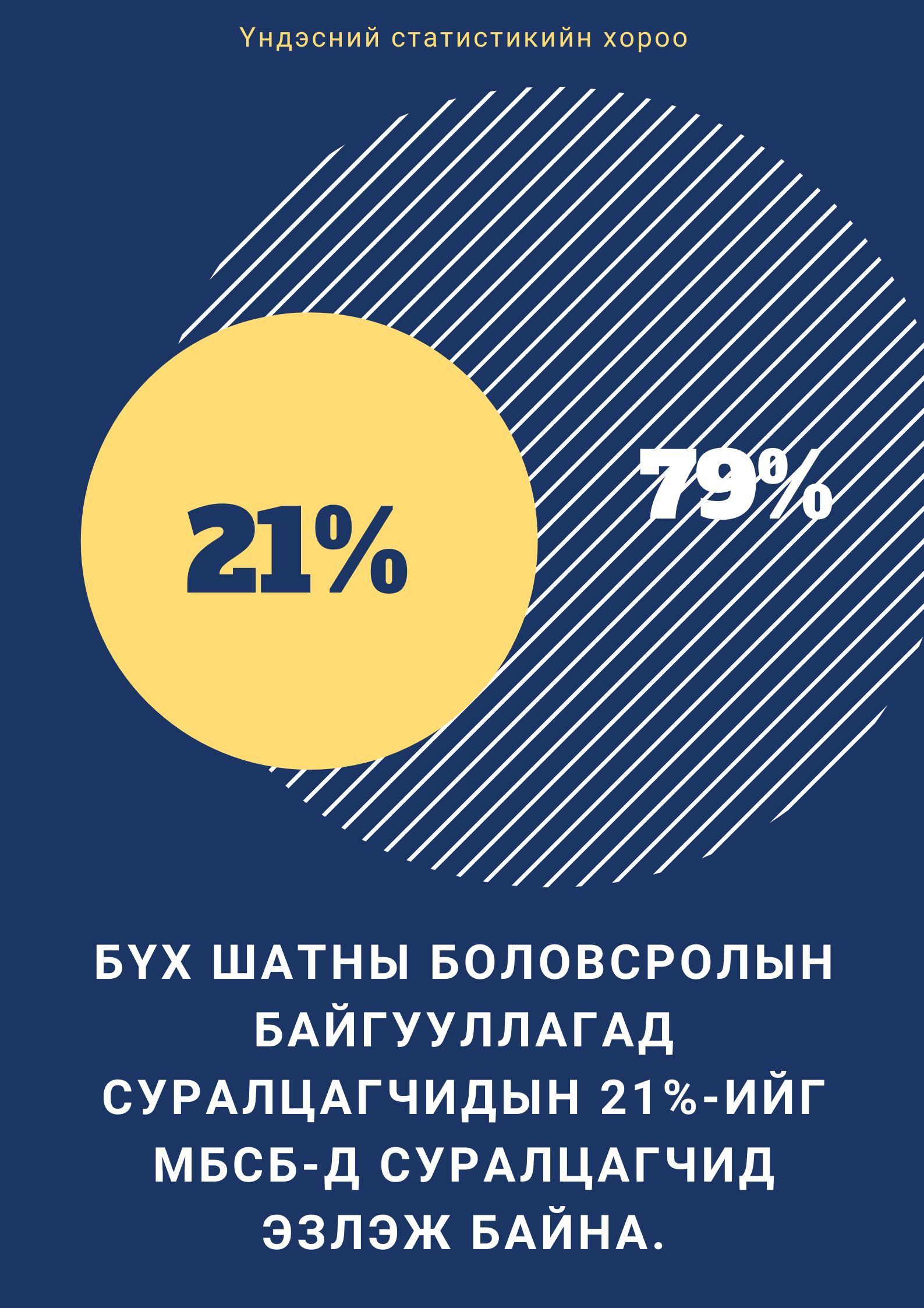 Эхлээд бид боловсролын салбарын жижигхэн статистикийг харвал бүх суралцагчдын 79% нь дээд боловсролыг, 21% нь мэргэжлийн боловсролыг сонгожээ.