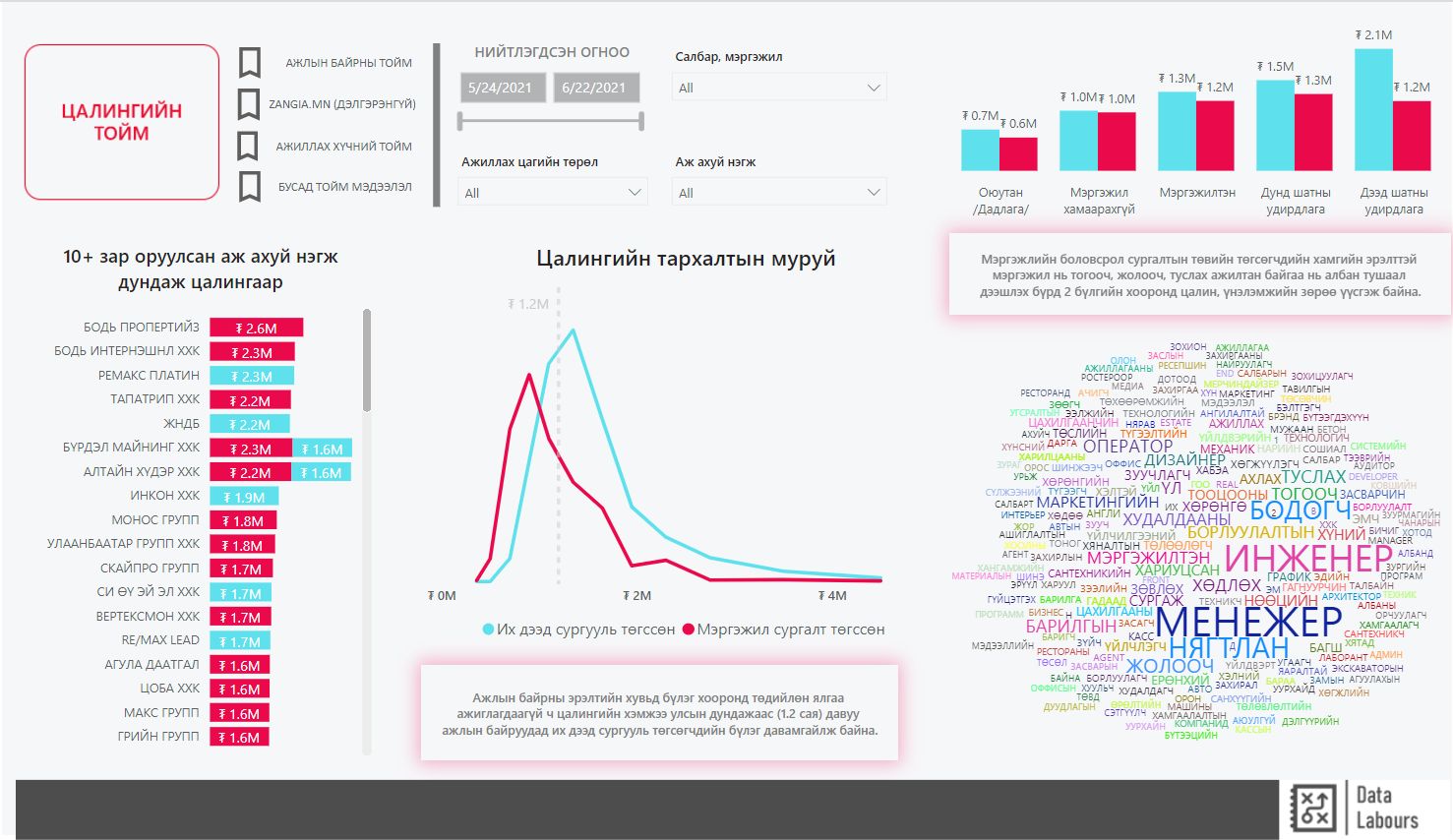 Бас өргөн сэдэв ч гэсэн бид хөдөлмөрийн зах зээлийн бодит эрэлт, ажил олгогчдод шаардлагатай ажиллах хүчний хэрэгцээг хамгийн бодитой тодорхойлж чадах платформуудын нэг бол одоогийн www.zangia.mn (хуучин biznetwork.mn) гэж тодорхойллоо. Бид багийн супер “Дата Аналист” Сумьяагийнхаа тусламжтайгаар энэхүү платформын бүхий л өгөгдөлд шинжилгээ хийж чадсан ба гарсан үр дүнг мэргэжлийн боловсролын салбартай холбож учрыг нь олохыг хичээлээ.