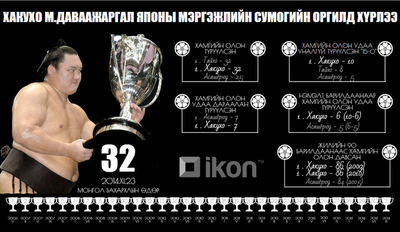Японы мэргэжлийн сумогийн 69 дэх Их аварга Хакухо М.Даваажаргал 32 дахь түрүүгээ хүртэж сумо бөхийн ноён оргилд гарсан юм. Тэрбээр арваннэгдүгээр сарын башёд 14 даваа нэг унасан амжилтаар түрүүллээ.